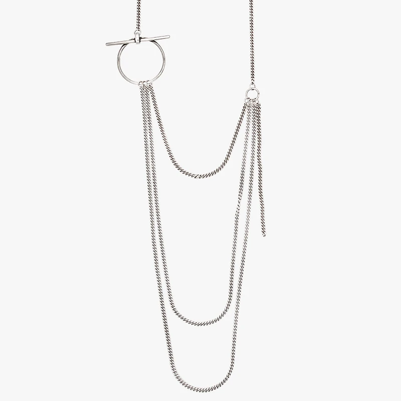 Materiales: Aleación de zinc y otros metales, cadena de latón, bañados en plata Medidas: - Largo collar (en maniquí) 33 cm desde la base del cuello- Ancho cadena 4 mm- Abalorio de 5 x 6 cm