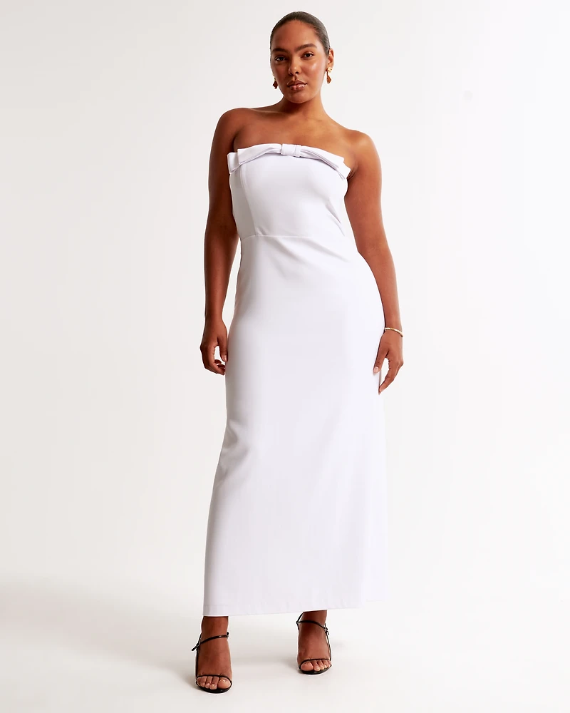 Flattering strapless maxi dress in our sculpting stretch-enhanced satin fabric. Features removable straps, a clean column skirt, a bow detail at the neckline and functional zipper closure for the perfect fit.