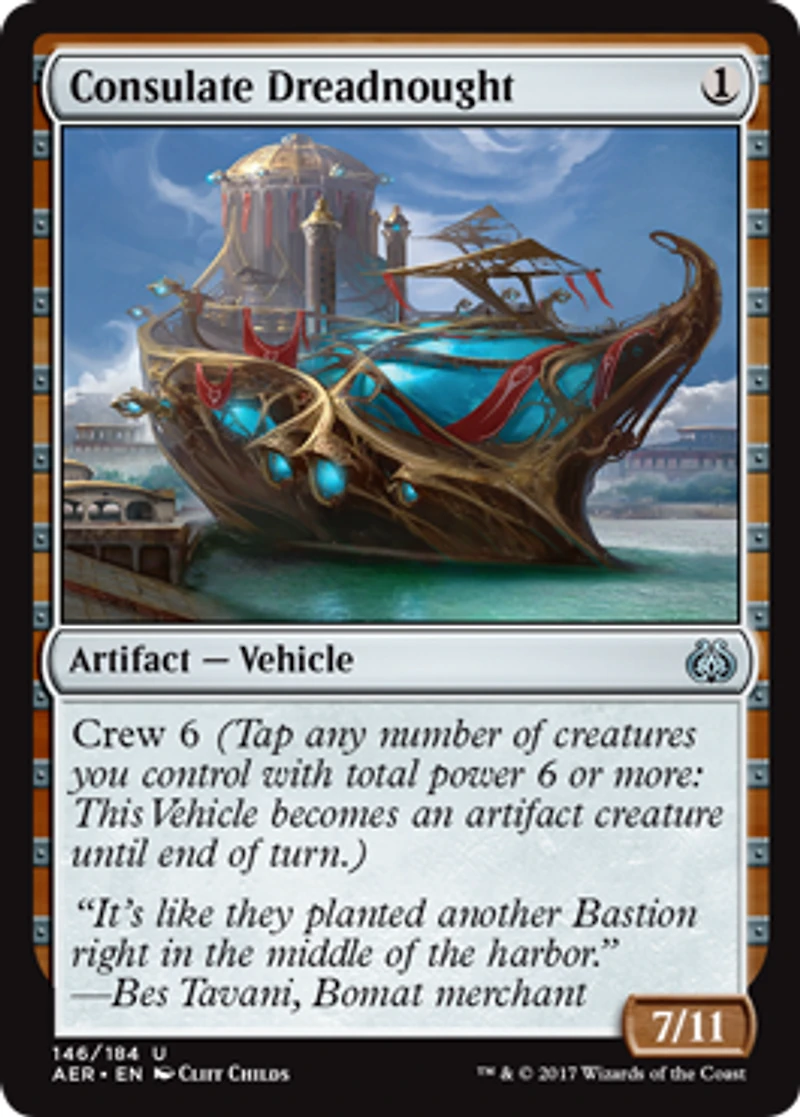 Color: Artifact Card Text: Crew 6 (Tap any number of creatures you control with total power 6 or more: This Vehicle becomes an artifact creature until end of turn.) Rarity: U Cost: 1 Pow/Tgh: 7/11 Card Type: Artifact - Vehicle Artist: Cliff Childs Name: Consulate Dreadnought Finish: Regular Card Number: 146/184 Set Name: Aether Revolt
