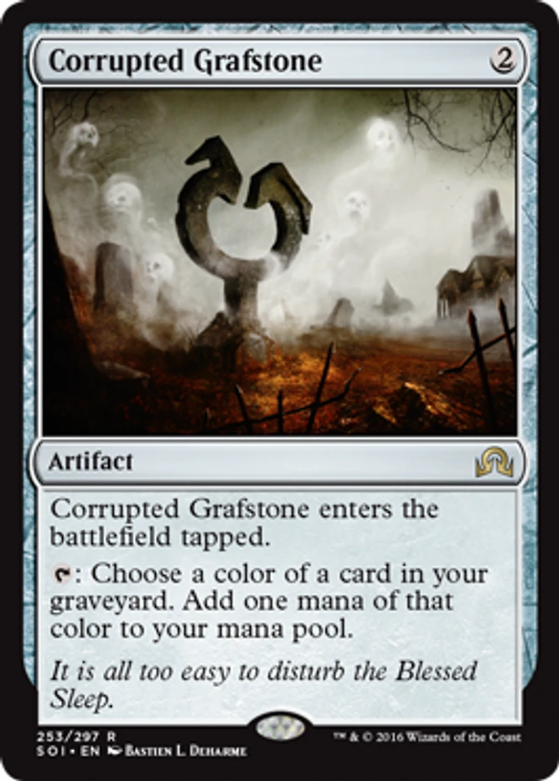 Color: Artifact Card Text: Corrupted Tombstone enters the battlefield tapped. T: Choose a color of a card in your graveyard. Add one mana of that color to your mana pool. Rarity: R Cost: 2 Card Type: Artist: Bastien L. Deharme Name: Corrupted Grafstone Finish: Regular Card Number: 253/297 Set Name: Shadows Over Innistrad