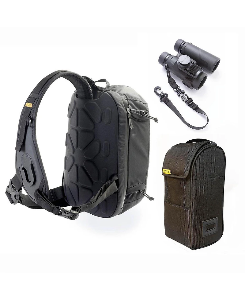 Hyker Sling bag for binoculars includes our Ccs Everything Bracket, a sturdy self-securing closure strap to secure the bracket, plus quick-release tether strap. Insert case with dividers also included.For years, camera bag manufacturers have been trying to figure out how to help you access your gear quickly so you never miss a shot. From gimmicks like side doors and rotating bags to car parts and other hardware, they've all tried different solutions. The Cotton Carrier Hyker is the ultimate answer. Don't keep your gear in the bag - carry it on the outside, so it's always ready to go!Introducing the New Hyker Sling bag from Cotton CarrierDiscover the ultimate sling bag designed for adventurers. Lightweight, durable, and packed with features, the Hyker Sling bag is your perfect companion for every journey.Think outside the bagHYKER is a comfortable ergonomic 12L Sling bag that includes our patented Twist and Lock receiver on the strap.