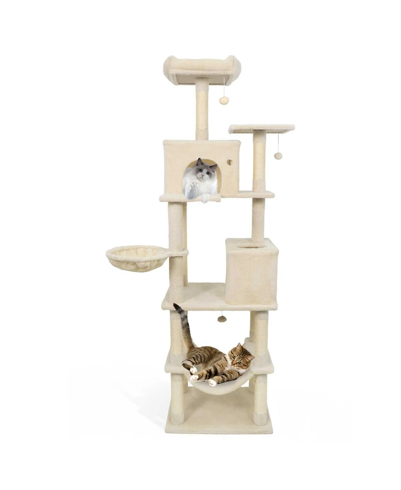 This 80 inch cat tree in beige provides a complete activity center for indoor cats. A spacious enclosed condo offers a cozy private retreat, while the padded perch delivers an elevated spot for relaxation and observation. Premium sisal scratching posts encourage healthy claw maintenance and help protect household furniture from scratching damage. A soft hammock adds a gentle swinging rest spot that cats love. An anti-tip device allows secure wall mounting for households with active climbers. Ideal as cat scratcher for homes that want style and function together. Soft plush fabric throughout ensures gentle comfort against your cat's fur, and the sturdy engineered board base provides reliable support for daily play.