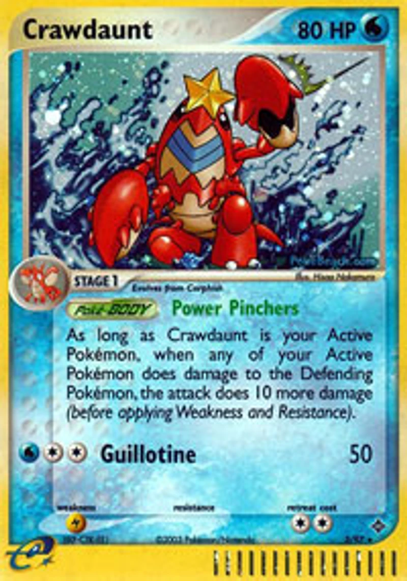Set: EX Dragon Card Number: 3/97 Rarity: Holo Rare Illustrator: Hisao Nakamura Retreat Cost: 2 Weakness: Lightning HP: 80 Stage: Stage 1 Card Type: Water Name: Crawdaunt Finish: Holo Attack #1: W Poison Claws (10) Flip a coin. If heads , the Defending Pokemon is now Poisoned. Attack #2: CCC Rend (30+) If the Defending Pokemon has any damage counters on it this attack does 30 damage plus 30 more damage. Manufacturer: The Pokemon Company