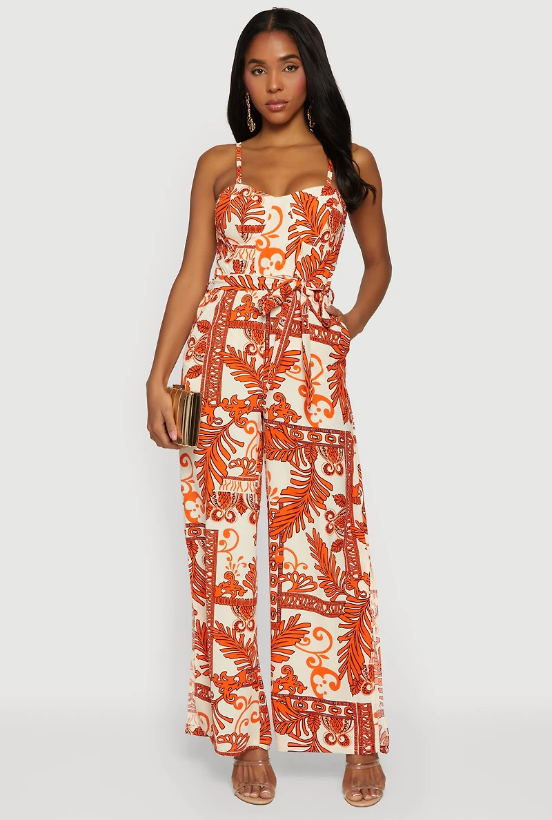 This sleeveless jumpsuit features a scoop neckline and adjustable spaghetti straps, complemented by a smocked back for a flexible fit. Its wide-leg, full-length pants create a relaxed silhouette, while the tie waist belt adds shape. Crafted from soft crepe knit with a printed pattern, it suits casual and vacation wear.