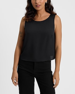 This crew neck tank features a V cut in the back and a slightly abbreviated hem.