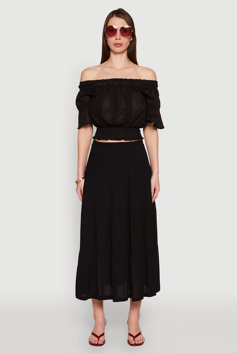 Get ready to turn heads with our Crochet Detail Off The Shoulder Crop Top. Perfect for adding a touch of boho chic to your wardrobe, this top features delicate crochet accents and flutter sleeves that give you a breezy, effortless vibe. Its classic fit and cropped hem make it versatile enough for any occasion, whether you're hitting a festival or just hanging out with friends. Embrace your free spirit and stay stylish without breaking the bank! Features crochet detail and smocked accents for a trendy, textured look Off the shoulder neckline adds a flirty, feminine touch 3/4 flutter sleeves for a breezy, relaxed fit Classic fit with a cropped hem for a timeless silhouette Perfect for boho and crochet-inspired outfits Affordable price without sacrificing style Model Pictured Wearing Size S Height 5 ft 9 in, Bust 34 in, Waist 27 in, Hips 38 in Fits True To Size Content and Care Material: 100% Cotton Care Instructions: Machine Wash, Tumble Dry Country Of Origin: India Rainbow Item Number 1004038346592 BLACK - 1004038346592001
