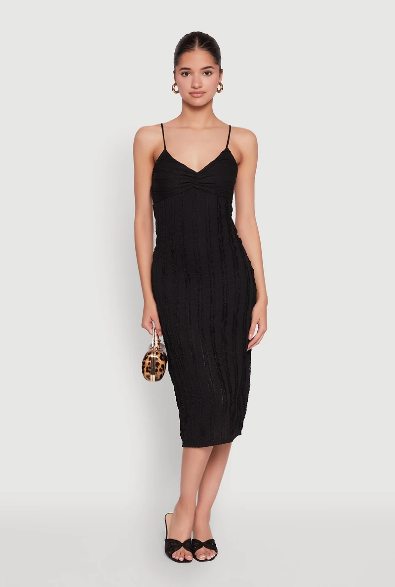 Step into effortless style with our Crochet Detail Slit Back Cami Bodycon Dress. Perfect for turning heads on casual days or adding a touch of crochet charm to your look, this mid-length dress is designed to hug your curves and showcase your unique vibe. The sleeveless V-neck makes it a breezy, flattering choice, while the textured knit fabric and crochet details add a playful, trendy touch. Whether you're out with friends or enjoying a weekend getaway, this dress is your new go-to for chic comfort and cool confidence.