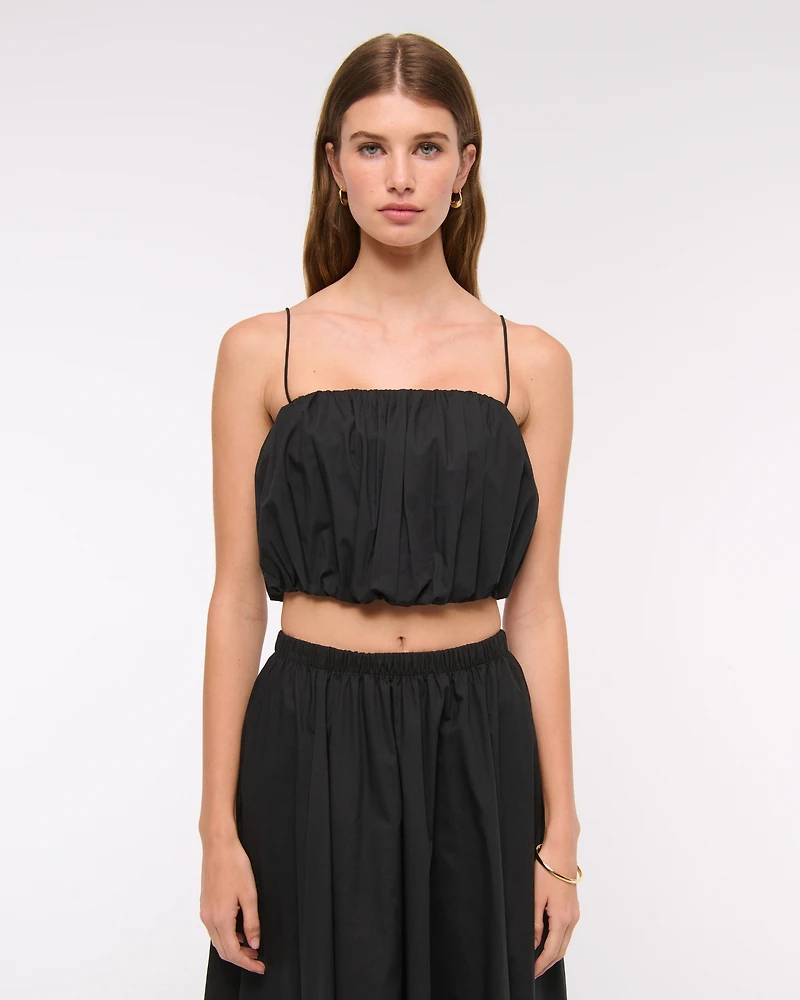 Flattering cami top in a soft poplin fabric and cropped length, with ruching details along the bodice, adjustable straps and on-trend bubble hem.