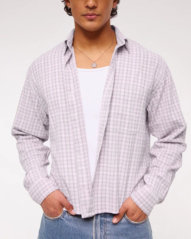 Short-Sleeve Cropped Textural Plaid Button-Up Shirt