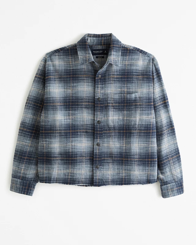Short-Sleeve Cropped Textural Plaid Button-Up Shirt