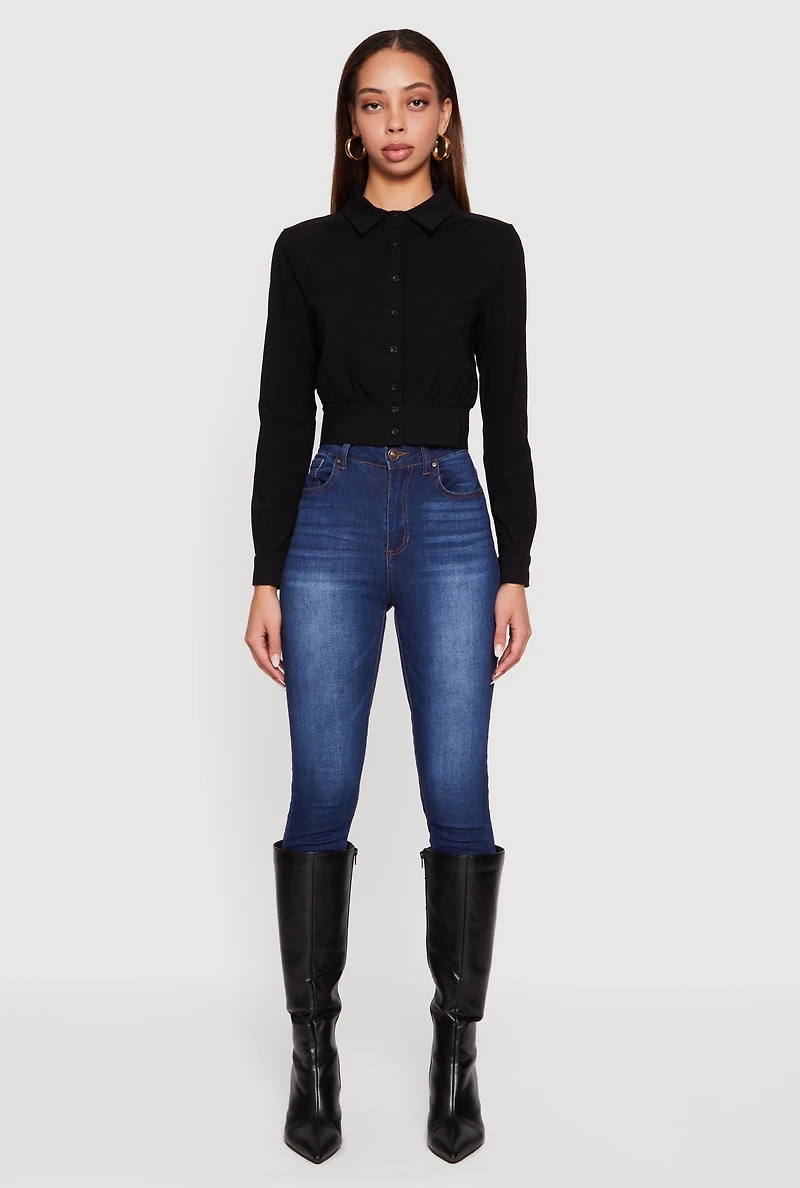 Cropped Long Sleeve Button Front Smocked Back Shirt