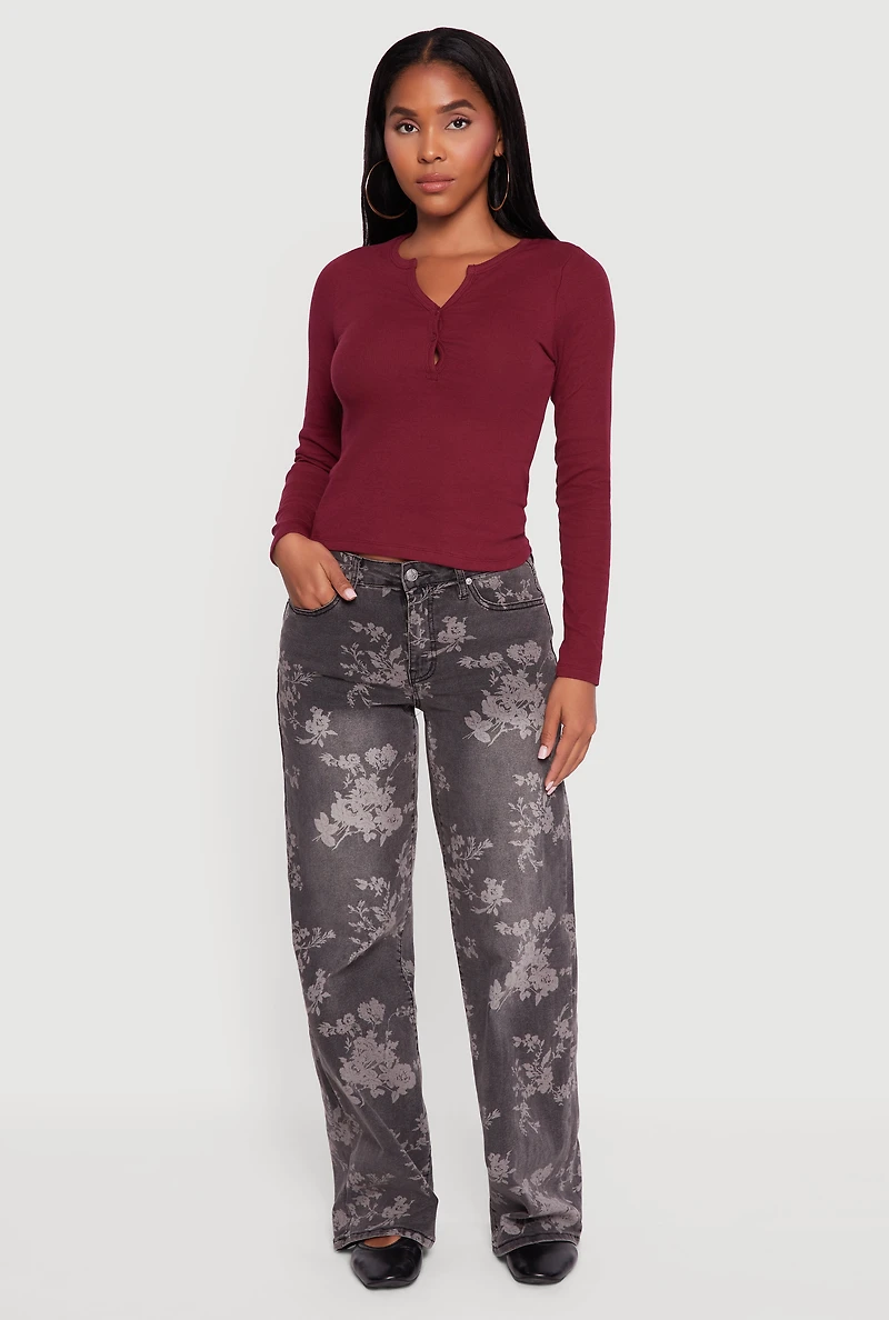 Cropped Long Sleeve Notch Neck Henley Top