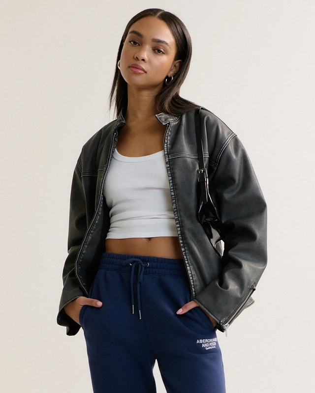 Cropped Sherpa-Lined Vegan Leather Aviator Jacket