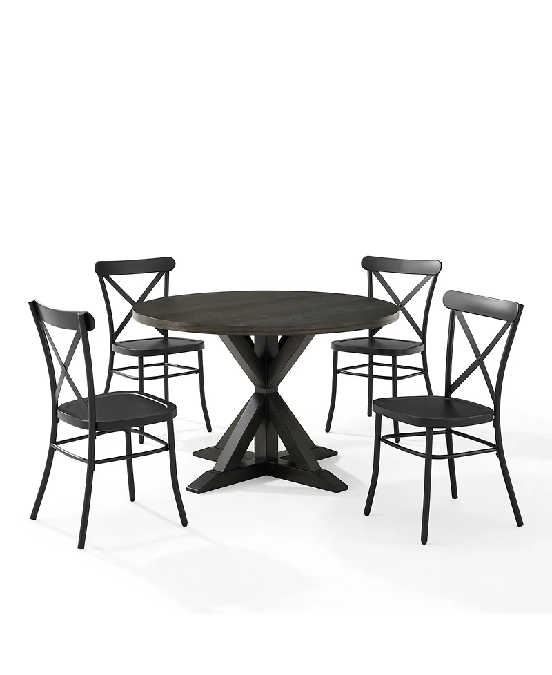 Blending rustic wood and sturdy steel, the Hayden round dining set with Camille chairs features a round pedestal dining table surrounded by four all-metal X-back dining room chairs. Crafted with intersecting legs, the table's pedestal base makes this dining set a timeless centerpiece for your home.