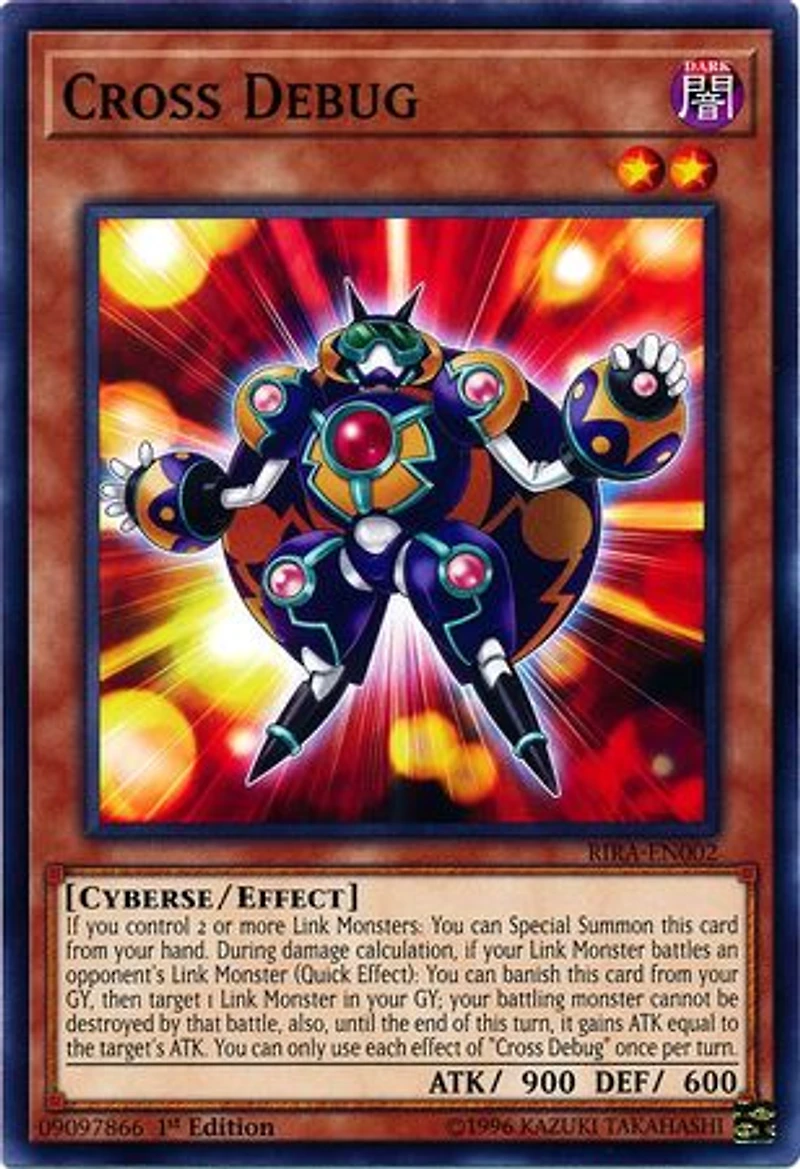 Passcode: 09097866 Set: Rising Rampage ATK/DEF: 900 / 600 Card Number: RIRA-EN002 Monster Type: Cyberse Rarity: Common Attribute: DARK Card Text: If you control 2 or more Link Monsters: You can Special Summon this card from your hand. During damage calculation if your Link Monster battles an opponent's Link Monster (Quick Effect): You can banish this card from your GY then target 1 Link Monster in your GY your battling monster cannot be destroyed by that battle also until the end of this turn it gains ATK equal to the target's ATK. You can only use each effect of "Cross Debug" once per turn. Level: 2 Card Type: Effect Monster Name: Cross Debug Edition: 1st