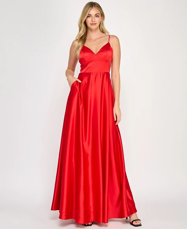 Crystal Doll Juniors' Sleeveless Lace-Up-Back Satin Gown