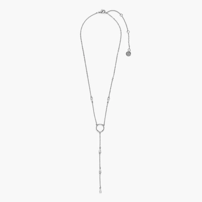 Features:- Brass base with rhodium plating.- Flat cable chain: 14" with 3" extension.- Drop of choker is approx. 1.5" in length.- Circle charm: 12.5mm diameter.- Drop charms: 5mm (L) x 3.5mm (W).