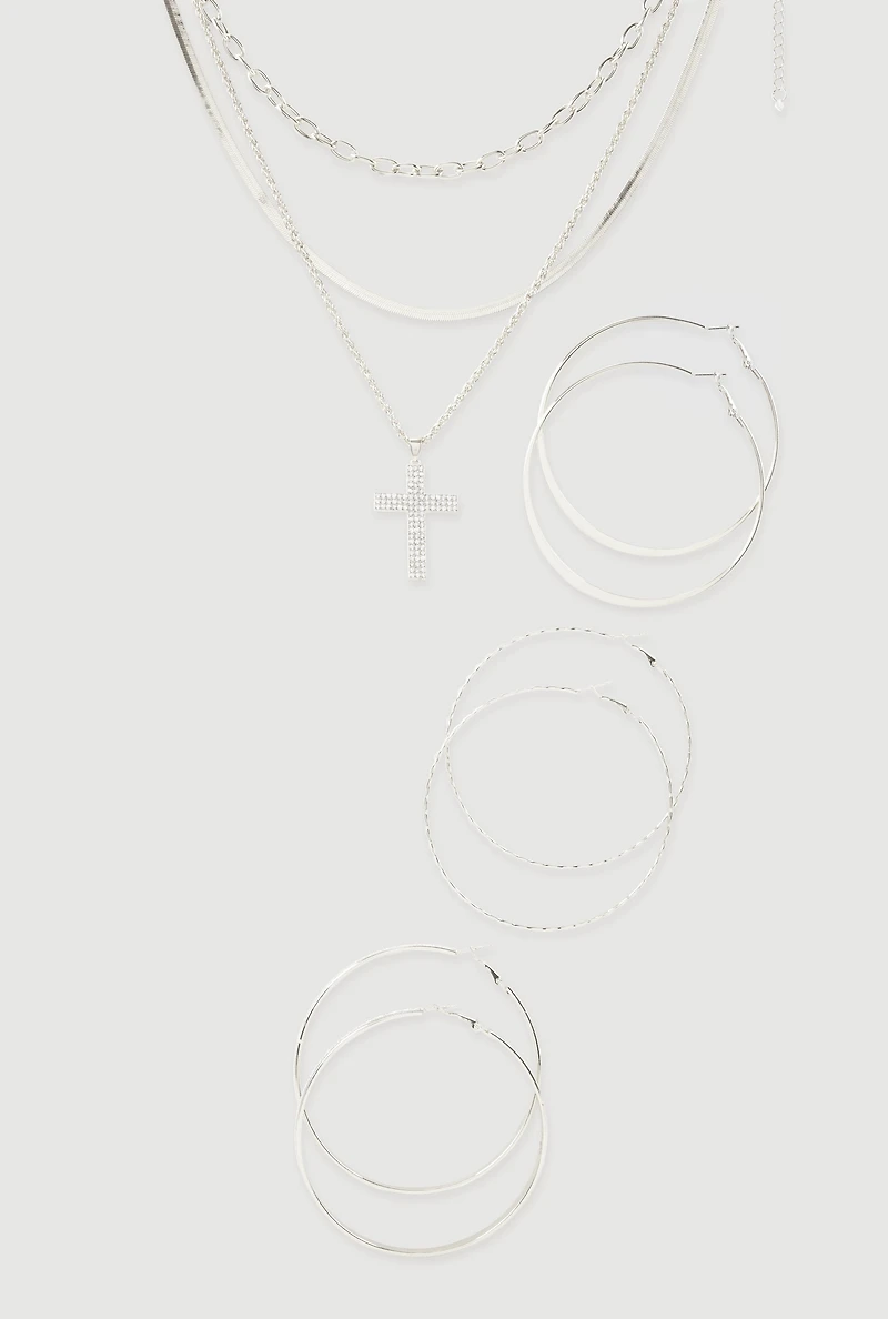 Cubic Zirconia Layered Cross Necklace and Hoop Earrings Set of 4 in San Juan, PR