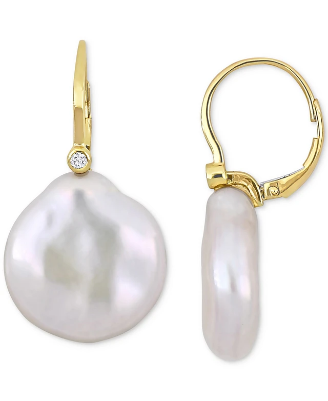 Cultured Freshwater Button Pearl (17-1/2 - 18mm) & Diamond (1/20 ct. t.w.) Leverback Drop Earrings in 14k Gold