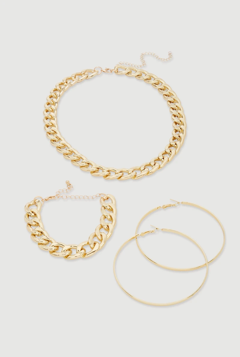 Curb Chain Bracelet and Necklace with Hoop EarringsCurb Chain Bracelet and Necklace with Hoop EarringsCurb Chain Bracelet and Necklace with Hoop Earrings