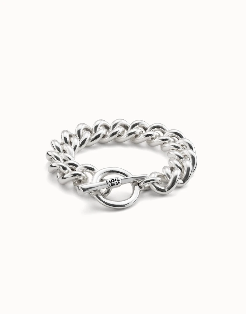 Sterling silver-plated bracelet with curb chain and a hoop and bar clasp. Jewel 100% handcrafted in Spain, achieving a unique design finish.