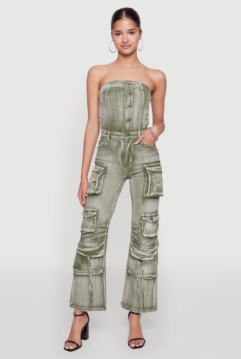 Daisy Denim Strapless Flare Jumpsuit with Cargo Pockets