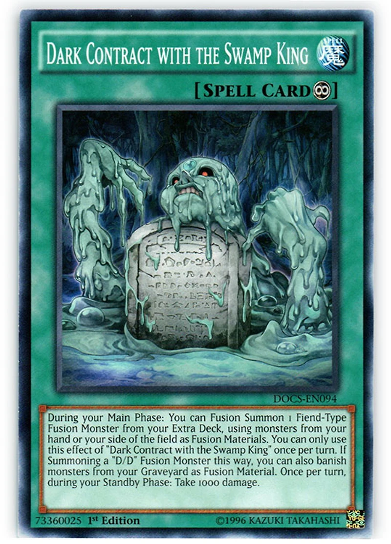 you can also banish monsters from your Graveyard as Fusion Materials. You can only use this effect of "Dark Contract with the Swamp King" once per turn. Once per turn