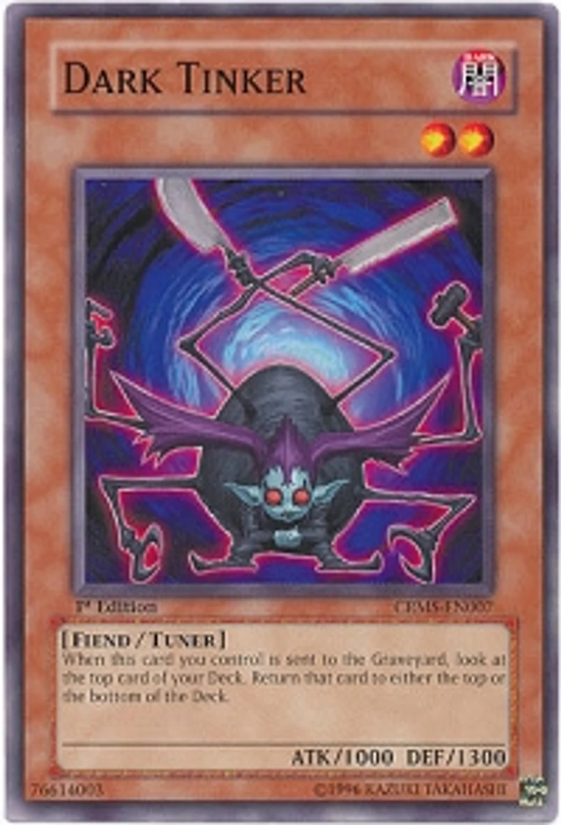 Card Rules: No rulings available for this card. Passcode: 76614003 Set: Crimson Crisis ATK/DEF: 1000/1300 Card Number: CRMS-EN007 Monster Type: Fiend Rarity: Common Attribute: Dark Card Text: When this card you control is sent to the Graveyard , look at the top card of your Deck. Return that card to either the top or the bottom of the Deck. Level: 2 Card Type: Tuner Monster Name: Dark Tinker Edition: 1st