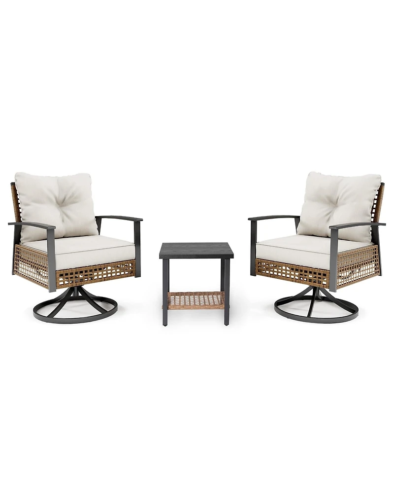 Create a serene bohemian oasis with this Woven Rattan Swivel Rocking Chair 3-Piece Set in Beige, where relaxed style meets everyday comfort. The set includes two gracefully woven swivel rocking chairs and a coordinating side table, all crafted from durable synthetic rattan in a soft beige hue. Each chair offers a smooth 360° swivel and gentle rocking motion, while the included plush, weather-resistant cushions provide exceptional support for lounging, reading, or unwinding outdoors.Ideal for covered patios, sunrooms, porches, or airy living spaces, this set blends natural texture with modern boho elegance.