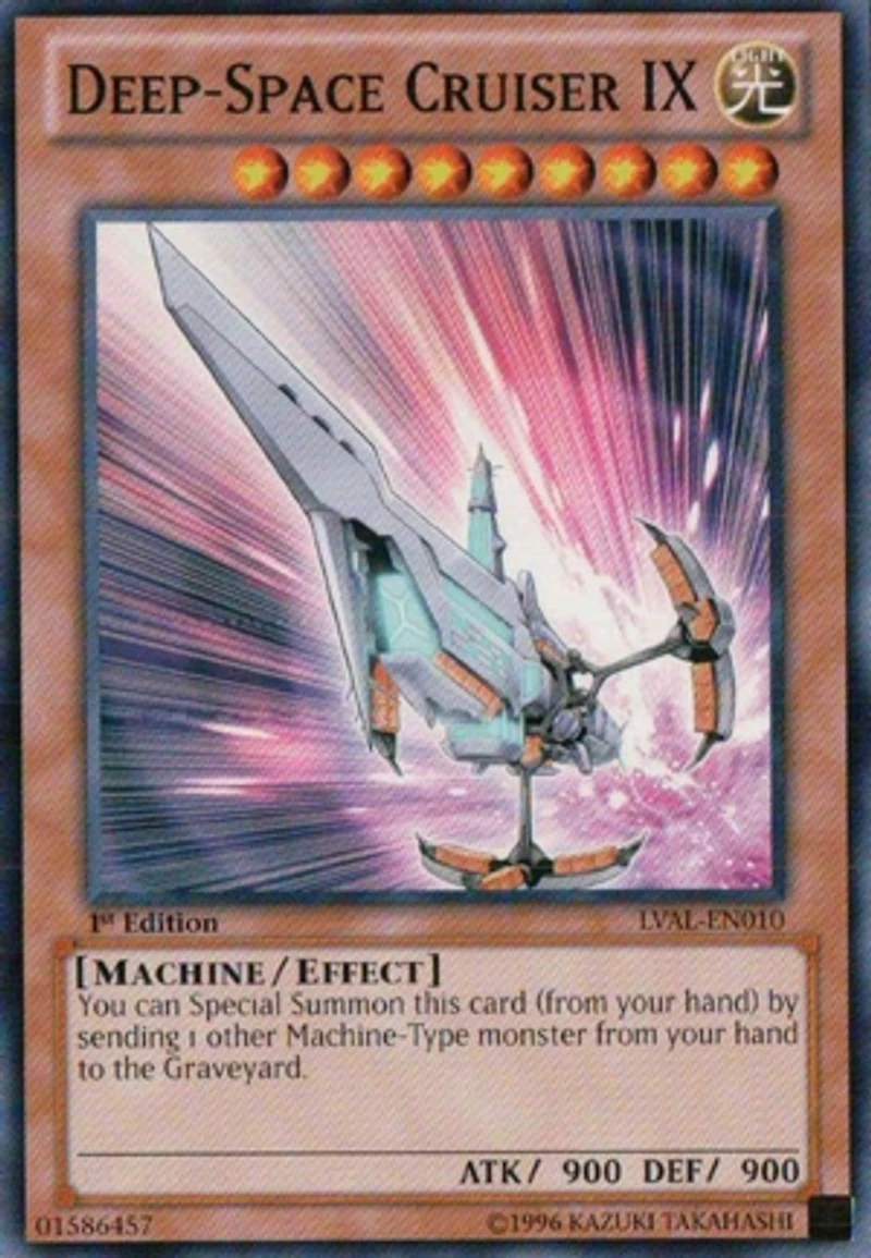 Passcode: 01586457 Set: Legacy of the Valiant ATK/DEF: 900/900 Card Number: LVAL-EN010 Monster Type: Machine/Effect Rarity: Common Attribute: Light Card Text: You can Special Summon this card (from your hand) by sending 1 other Machine-Type monster from your hand to the Graveyard. Level: 9 Name: Deep-Space Cruiser IX Edition: 1st