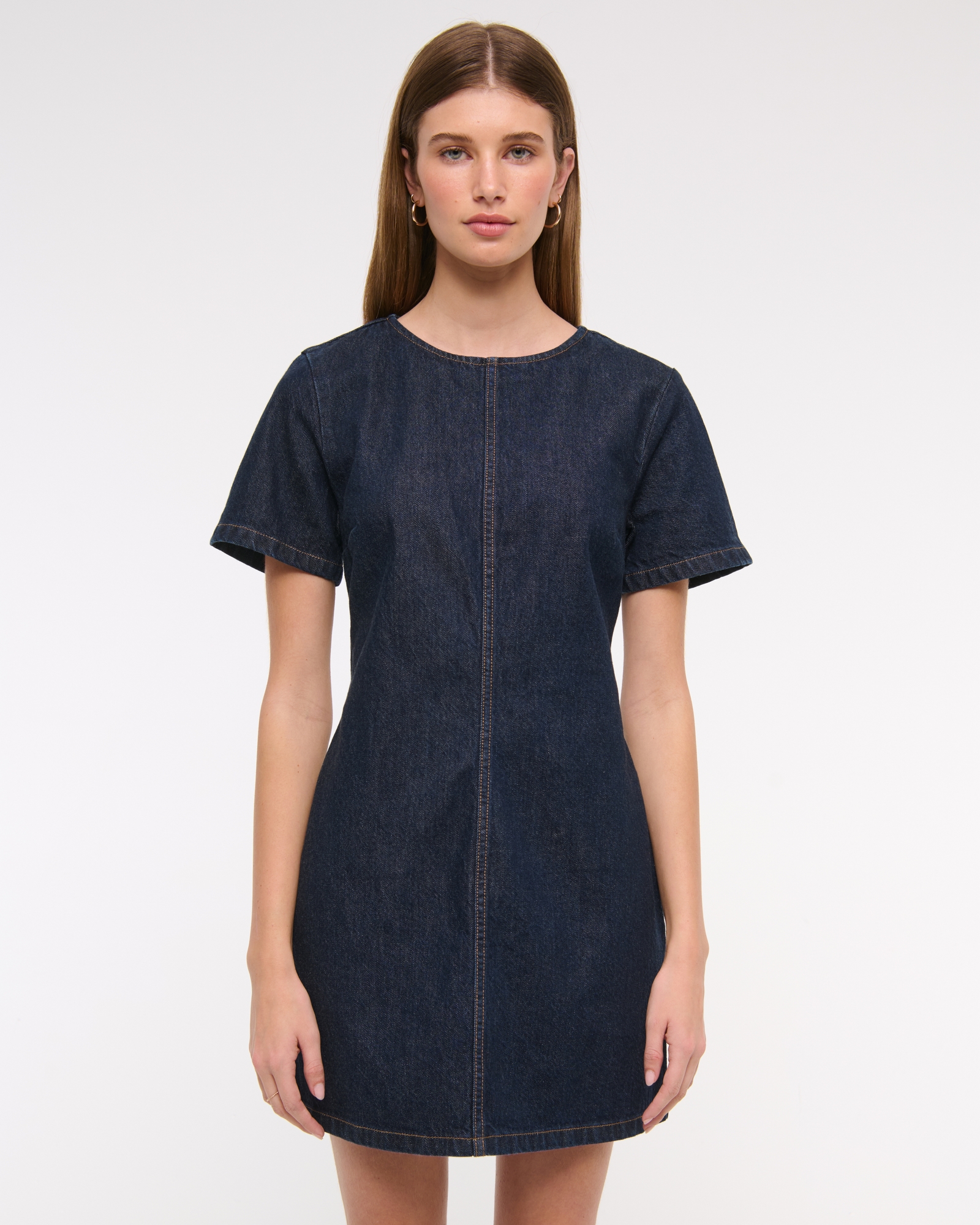 Easy-fitting short-sleeve mini dress in our classic denim fabric and shift silhouette, featuring an on-trend front seam detail and crew neckline.