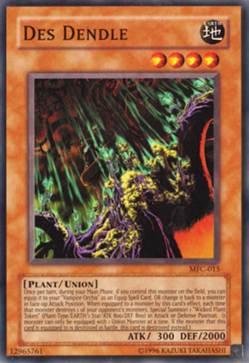 Card Rules: No rulings available for this card. Passcode: 12965761 Set: Magicians Force ATK/DEF: 300/2000 Card Number: MFC-015 Monster Type: Plant Rarity: Common Attribute: Earth Card Text: Once per turn , during your Main Phase if you control this monster on the field you can equip it to your 'Vampire Orchis' as an Equip Card OR unequip the Union equipment and Special Summon this card in face-up Attack Position. While equipped to a monster by this card's effect each time the equipped monster destroys 1 of your opponent's monsters Special Summon 1 'Wicked Plant Token' (Plant-Type/EARTH/1 Star/ATK 800/DEF 800). (1 monster can only be equipped with 1 Union Monster at a time. If the equipped monster is destroyed as a result of battle destroy this card instead.) Level: 4 Card Type: Union Monster Name: Des Dendle Edition: Unlimited