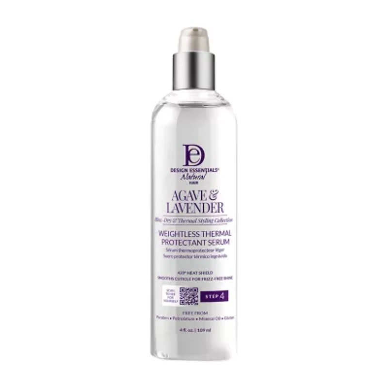 The Design Essentials agave and lavender thermal protectant serum shields strands from heat tools while taming frizz and adding shine. This salon-quality formula uses nourishing botanicals for professional-level results. Apply before styling to keep hair silky and smooth perfect for sleek blowouts or flat-ironed finishes that feel as healthy as they look.