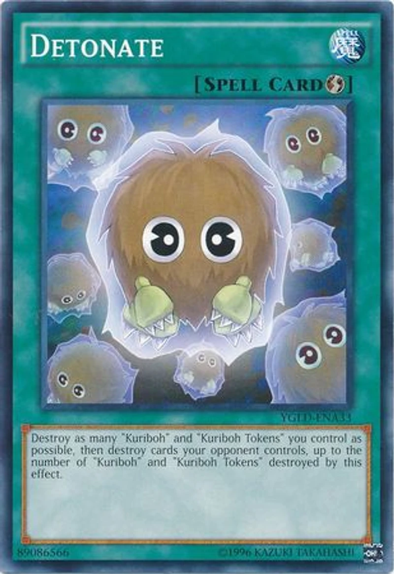 Passcode: 89086566 Set: Yugi's Legendary Decks Card Number: YGLD-ENA33 Rarity: Common Attribute: Spell Card Text: Destroy all face-up "Kuriboh" and "Kuriboh Tokens" you control , then destroy cards your opponent controls up to the number of "Kuriboh" and "Kuriboh Tokens" destroyed by this effect. Card Type: Quick-Play Spell Card Name: Detonate Edition: Unlimited