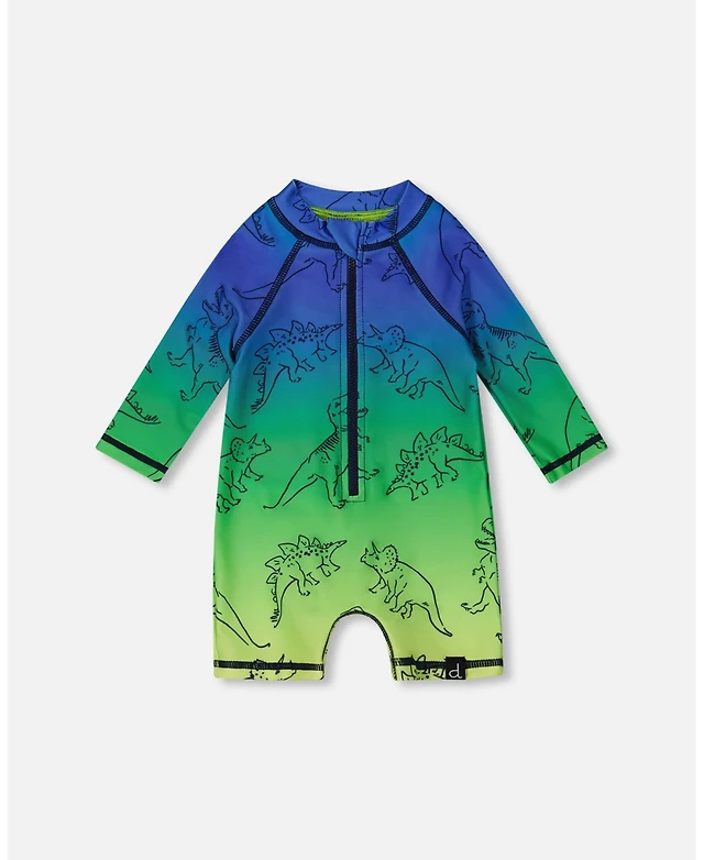 Deux par Deux Baby Boys Printed Long Sleeve One-Piece Rashguard Vibrant Blue And Green Dino