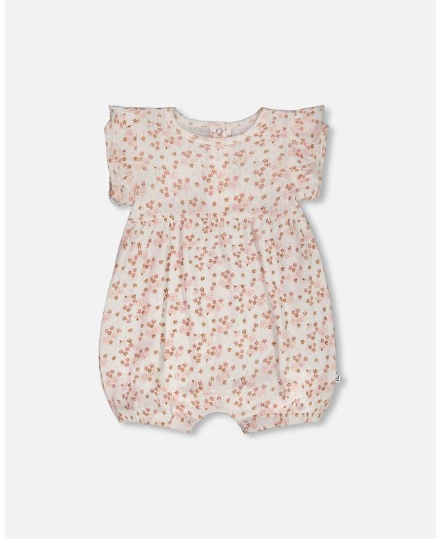Deux par Deux Baby Girls Cotton Pointelle Romper With Frills Printed White And Pink Flowers