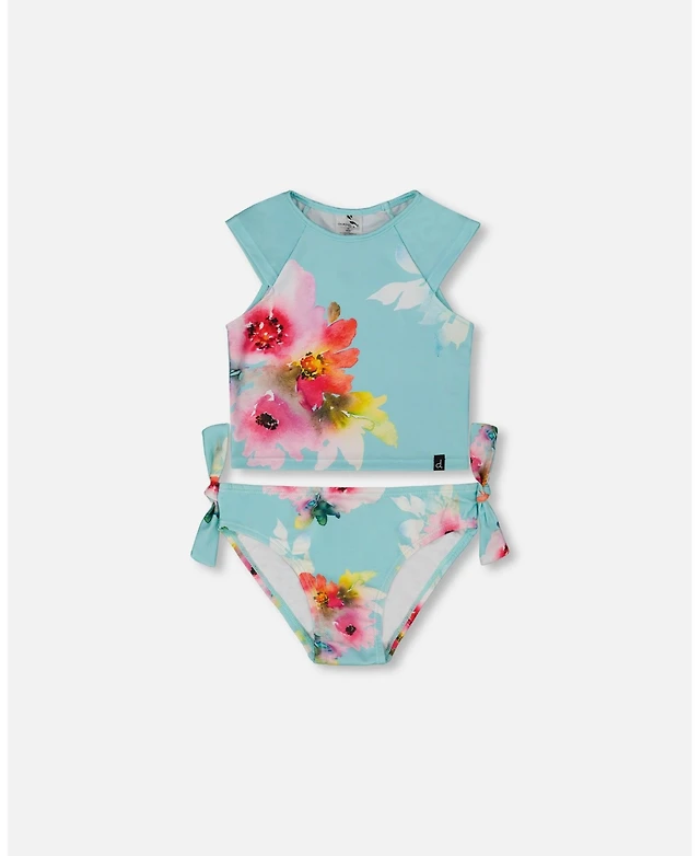 Deux par Deux Girls Printed Two-Piece Swimsuit Turquoise And Pink Flowers