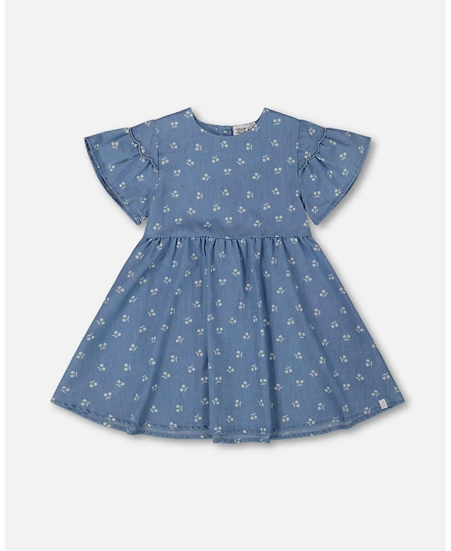 Deux par Deux Toddler Girls Printed Chambray Dress Blue And White Cherries - Toddler|Child
