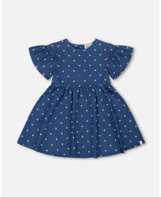 Deux par Deux Toddler Girls Printed Chambray Dress Navy Blue And White Hearts - Toddler|Child