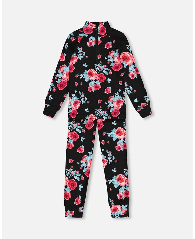 Deux par Deux Toddler Girls Two Piece Thermal Underwear Set Black Printed Roses - Toddler|Child