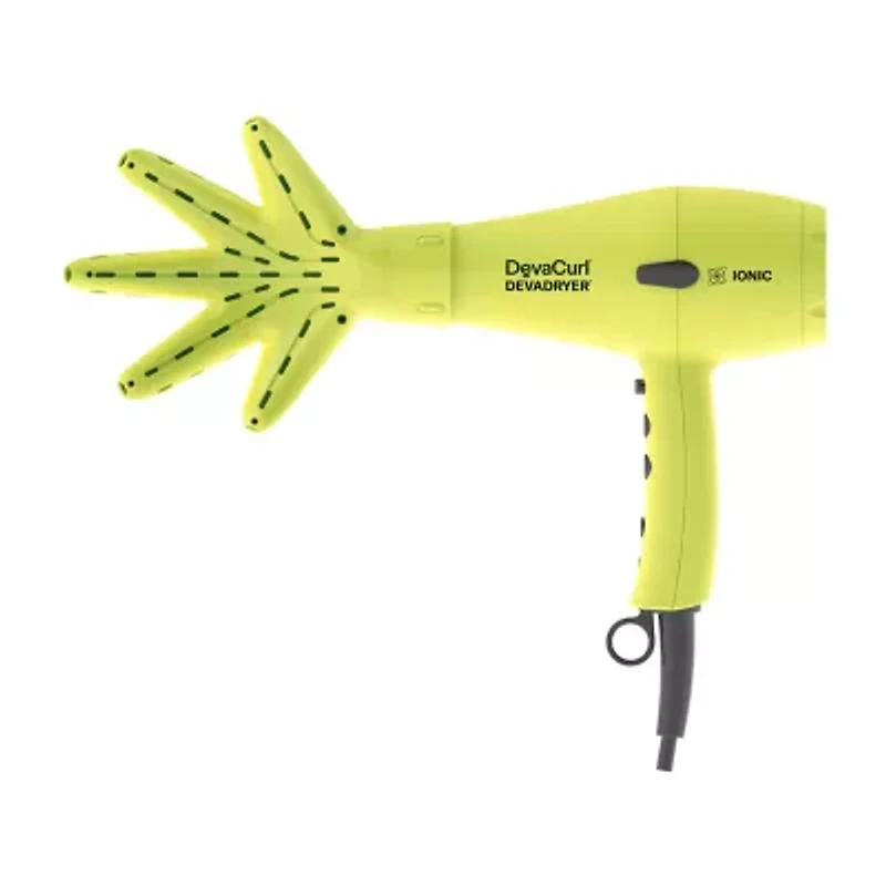Stylist Co-Developed with waves, curls, and coils in mind, our New & Improved lightweight DevaDryer features custom Curl Flexible Alternating Ionic Technology to help you achieve voluminous curls or a sleek blowout — you decide. Our patented, hand-shaped DevaFuser surrounds curls in 360-degree airflow and gets right to the roots (where it takes longest to dry) to help curls dry faster. Curl Flexible Alternating Ionic Technology, Light on + ions help improve volume, Light off – ions help smooth frizz