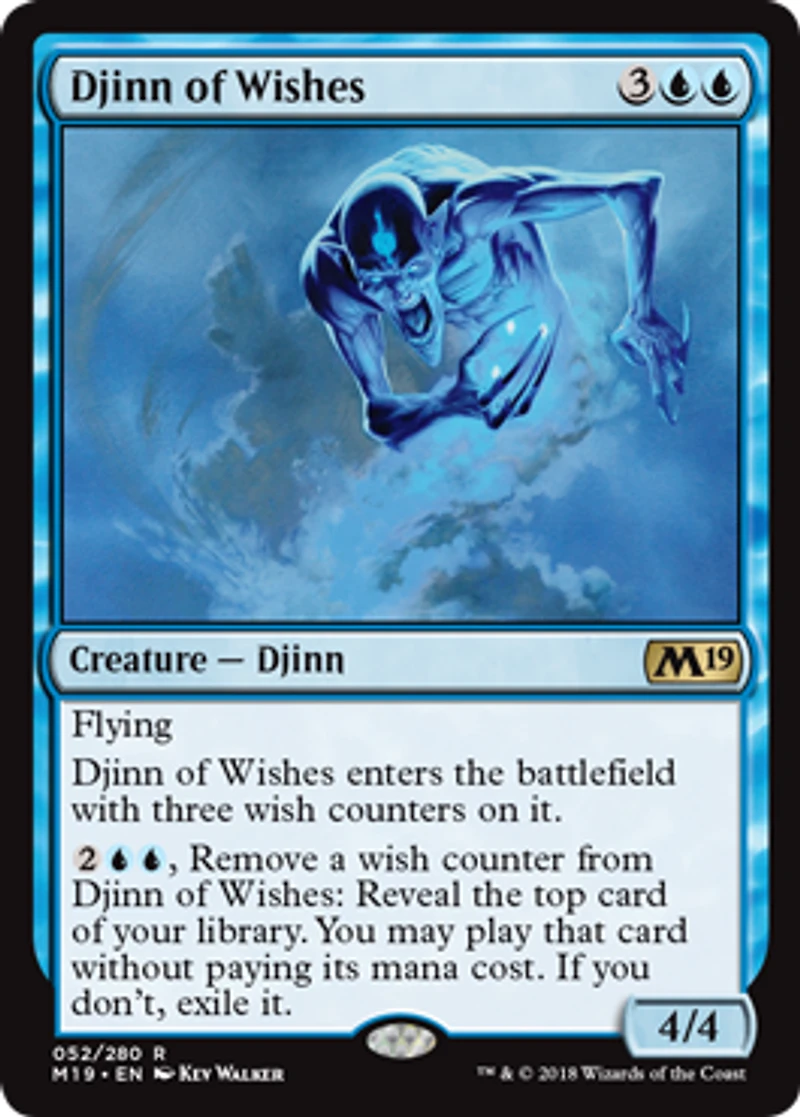 Color: Blue Card Text: FlyingDjinn of Wishes enters the battlefield with three wish counters on it.2UU , Remove a wish counter from Djinn of Wishes: Reveal the top card of your library. You may play that card without paying its mana cost. If you don't exile it. Rarity: R Cost: 3UU Pow/Tgh: 4/4 Card Type: Creature - Djinn Artist: Kev Walker Name: Djinn of Wishes Finish: Foil Card Number: 052/280 Set Name: Core Set 2019