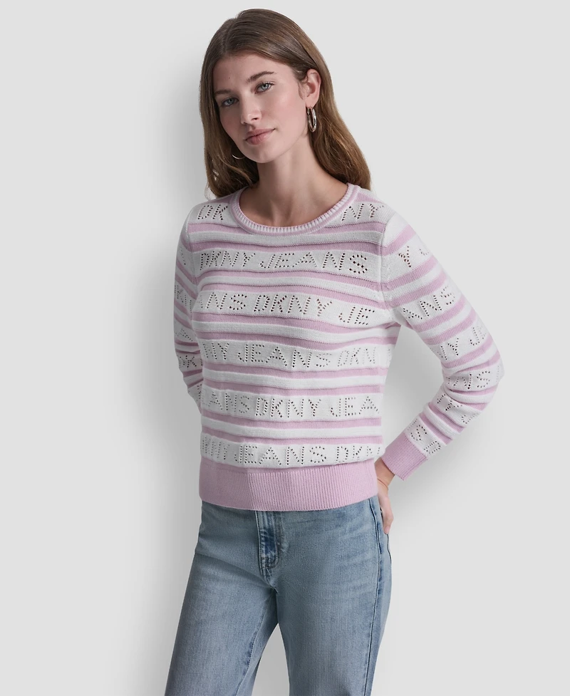 Dkny Jeans Women's Crewneck Logo Pointelle Striped Sweater