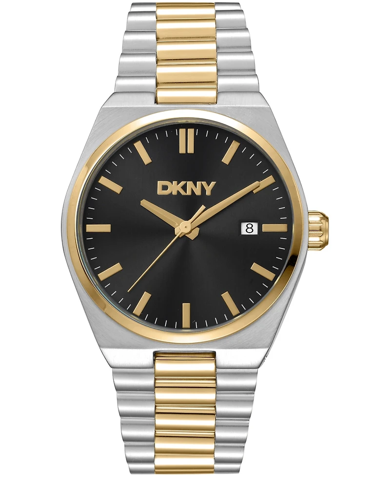 Clean geometry meets everyday function in this 40mm Dkny timepiece. The round stainless steel case frames a sleek black dial anchored by the Dkny logo at 12 o'clock and a practical date window at 3. Japanese quartz movement powers hours, minutes, and seconds with unfailing precision, while 10 Atm water resistance keeps pace with city life. A polished three-link Two-Tone Gold stainless steel bracelet completes the look.