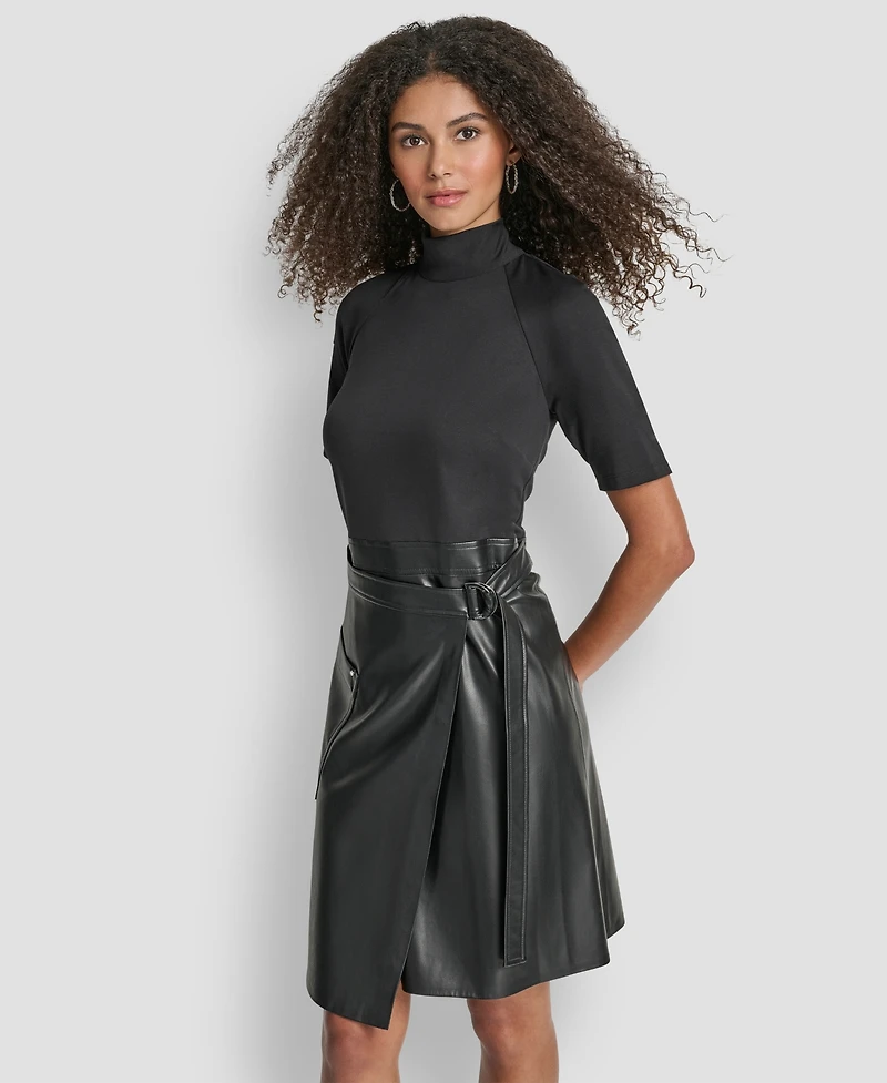 Let your day's story unfold in captivating style with the Dkny Short Sleeve Mock Neck Fit & Flare Dress, complete with a charming faux wrap skirt and defining buckle belt. Designed for the woman who lives her life to the fullest, this dress is your versatile companion for every chapter. The elegant fit-and-flare cut ensures comfort and grace from your first morning meeting to your last evening toast. The sophisticated mock neck offers a touch of refined professionalism, while the short sleeves provide year-round comfort. For work, it's tailored perfection; for leisure, it's playful sophistication. The cleverly designed faux wrap skirt and buckle belt detail not only flatter your silhouette but also effortlessly transition the dress from a day of productivity to an evening of laughter.