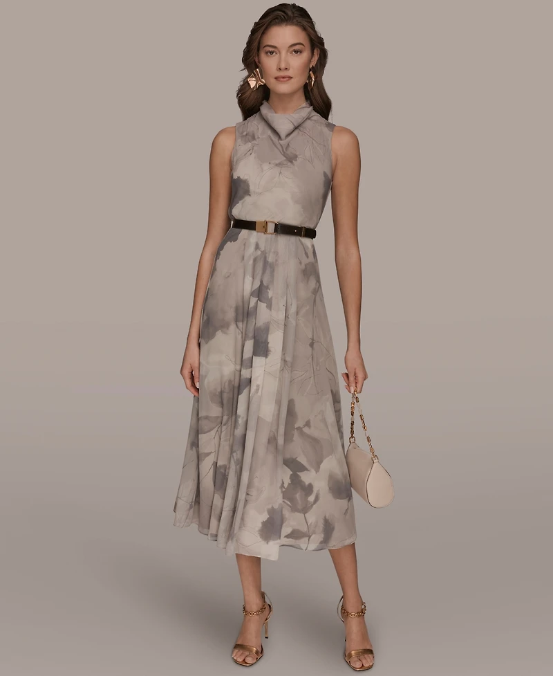 Donna Karan New York Women's Sleeveless Cowl Neck Floral Print Belted A-Line Midi Dress