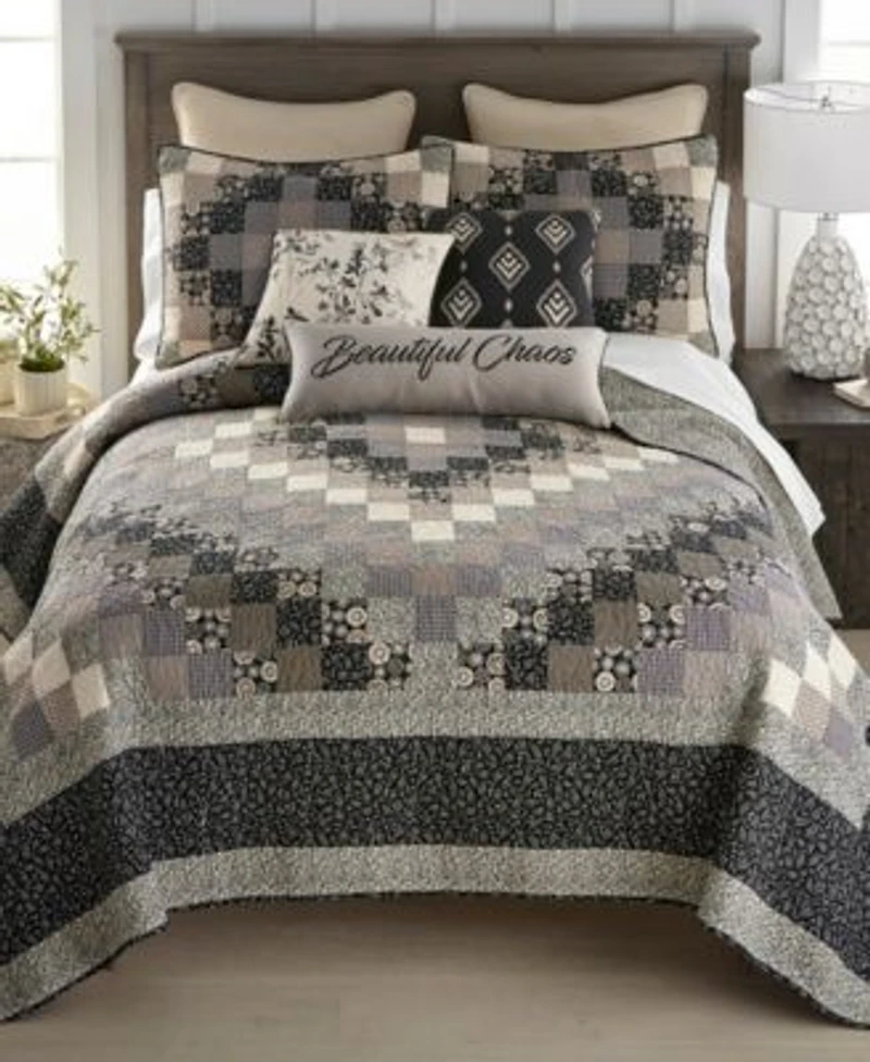 Introducing Donna Sharp Lexington Trip Cotton Quilt Collection, softer more neutral take on our classic trip around the world pattern. The quilt set features a classic trip-around-the-world pattern composed of small, evenly sized square patches arranged in concentric color waves. The color palette blends warm neutrals, soft taupes, beige, olive, and black, with a mix of floral, checkered, and textured prints adding visual depth. Floral patches are interspersed throughout, giving the design a delicate, vintage touch. The quilt is bordered with multiple coordinating bands: a narrow-speckled border in muted green tones, followed by a wide black border with a leaf-and-vine print, and finally framed by another narrow-speckled edge. The overall effect is cozy, traditional, and rich in detail, making it a perfect choice for a country cottage or rustic-inspired bedroom.