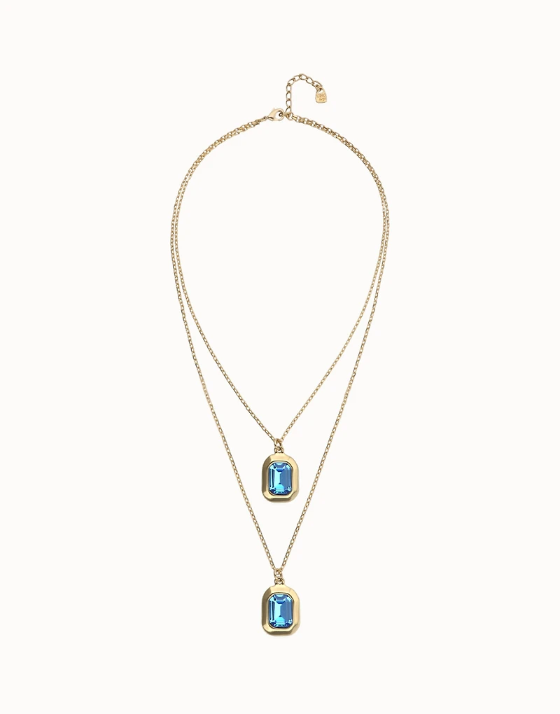 Gold-tone necklace with a double design, combining two pendants with rectangular faceted blue crystals.