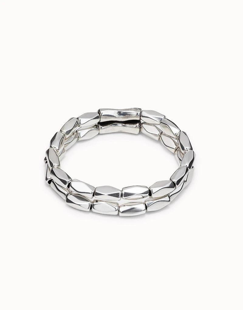 Elastic bracelet with a modern design and composed of faceted diamond-shaped pins, which you can wear on special occasions and with casual outfits. This silver-plated metal jewelry has been elaborated under a completely handmade process in Spain.