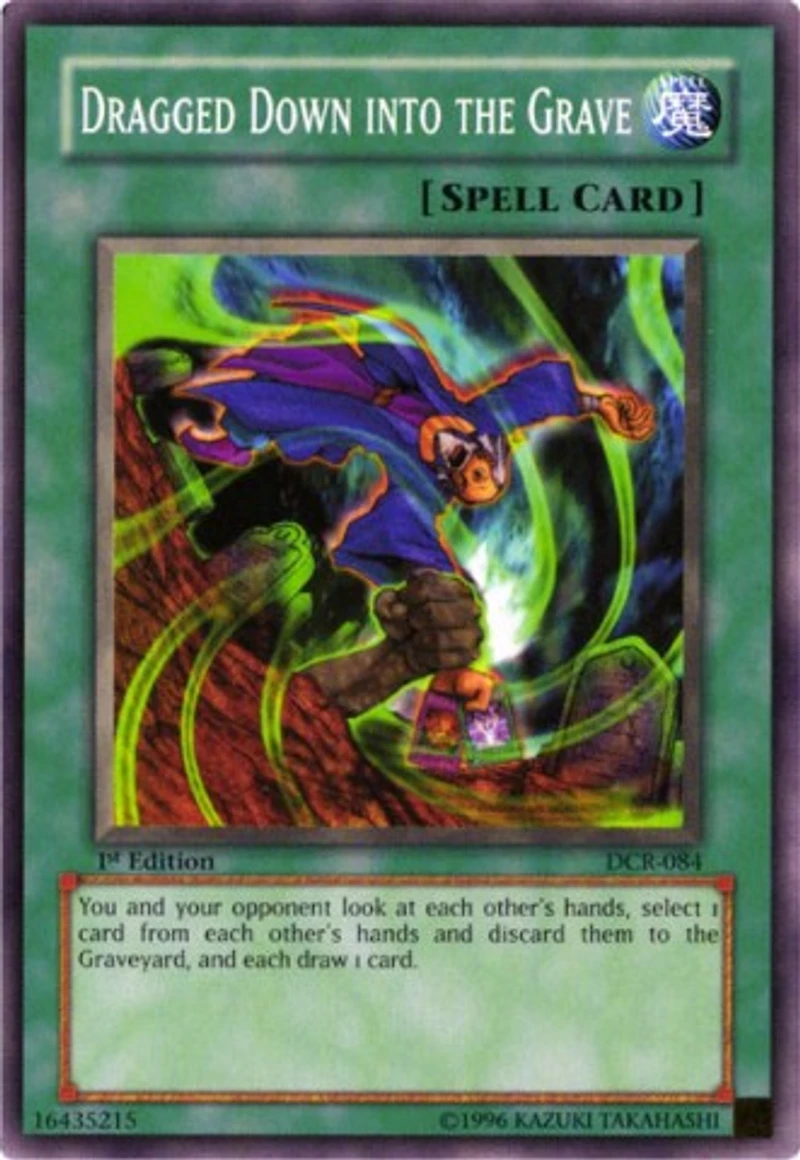 Card Rules: Rulings powered by The Netrep Passcode: 16435215 Set: Dark Crisis Card Number: DCR-084 Rarity: Common Attribute: Spell Card Text: You and your opponent look at each other's hands , select 1 card from each other's hands and discard them to the Graveyard and each draw 1 card. Card Type: Normal Spell Name: Dragged Down into the Grave Edition: Unlimited